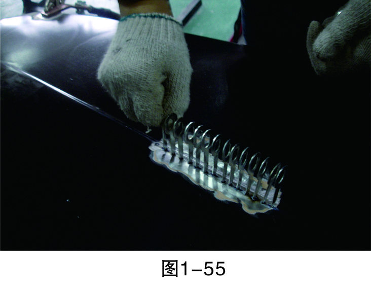 步驟18(拉低打高):對相對低的位置進行拉伸,對相對高的位置進行敲擊,要注意焊拉槍與鈑金錘的配合,重點是把握好力度,如圖1-59所示。
