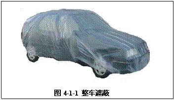 汽車修補(bǔ)噴涂時(shí),為了保護(hù)修補(bǔ)部位以外范圍不受漆霧、灰塵的污染,因此就要對(duì)非修補(bǔ)區(qū)域進(jìn)行覆蓋保護(hù),這就是所謂的遮蔽。遮蔽是非常重要的工作,所有部分修補(bǔ)涂裝(包括點(diǎn)修補(bǔ)、點(diǎn)擴(kuò)展修補(bǔ)和區(qū)域修補(bǔ))在噴漆前,都要對(duì)噴涂區(qū)域周圍的區(qū)域進(jìn)行遮蔽保護(hù),修補(bǔ)面積較大或點(diǎn)較多時(shí)還需進(jìn)行整車遮蔽(如圖4-1-1。有時(shí)在清除修補(bǔ)區(qū)域舊涂膜的作業(yè)和研磨、拋光等作業(yè)時(shí)也需要對(duì)相關(guān)部分進(jìn)行遮蔽保護(hù)。
