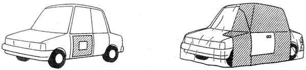 實(shí)際維修工作中所要遮蔽區(qū)域面積的大小,與所用的噴涂方法、噴槍的走槍方式、漆霧的散射范圍等都有密切關(guān)系,另外點(diǎn)修補(bǔ)噴涂和塊修補(bǔ)噴涂所用的遮蔽方法也不相同。因此,實(shí)際遮蔽工作中必須根據(jù)情況確定恰當(dāng)?shù)恼谏w范圍,盡量保證在每一種情況下遮蔽的面積最(如右圖4-3-2