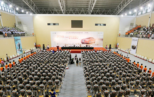 620上午,2013年全國職業(yè)院校技能大賽中職組“雪佛蘭杯”汽車運用與維修技能大賽開幕式在無錫汽車工程中等專業(yè)學校體育館舉行。交通運輸部道路運輸司王水平副司長、江蘇省教育廳楊湘寧副廳長、無錫市人民政府華博雅副市長、大賽主贊助商——上海通用汽車有限公司黨委書記黃強出席開幕式并致辭。裁判員代表洪永楠、參賽選手代表何宇先后宣誓。大賽開幕式由國家教育部職成教司農(nóng)村教育處劉杰處長主持。